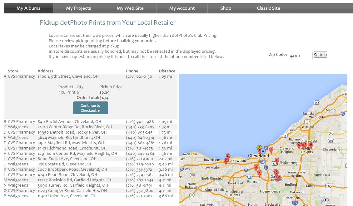 We're sorry, but local print pickup is temporarily unavailable. We are working on the software. Â In the meantime, you can download any dotphoto album to an SD card, and take the card to your drugstore for printing. Â Click here for info on downloading.