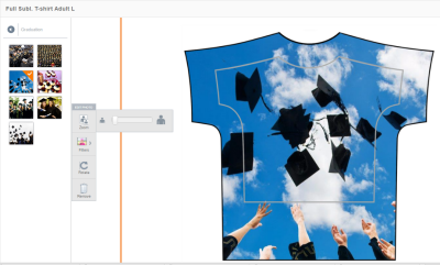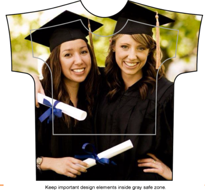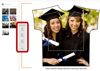 Edit and position your photos on the front and back of the shirt. Click on a the shirt to produce the Edit menu on left. By clicking on the Edit Menu, you can zoom in, change colors, rotate or remove the photo on your product. You can also click on the photo and hold the mouse button to position the photo by dragging it right, left, up or down. The photo may not move unless you zoom in on it first. NOTE: if you zoom in too far, the photo may have too little resolution to print well. Keep important design elements within the gray zone of the shirt. For instance, in the example below, the faces are within the gray zone.